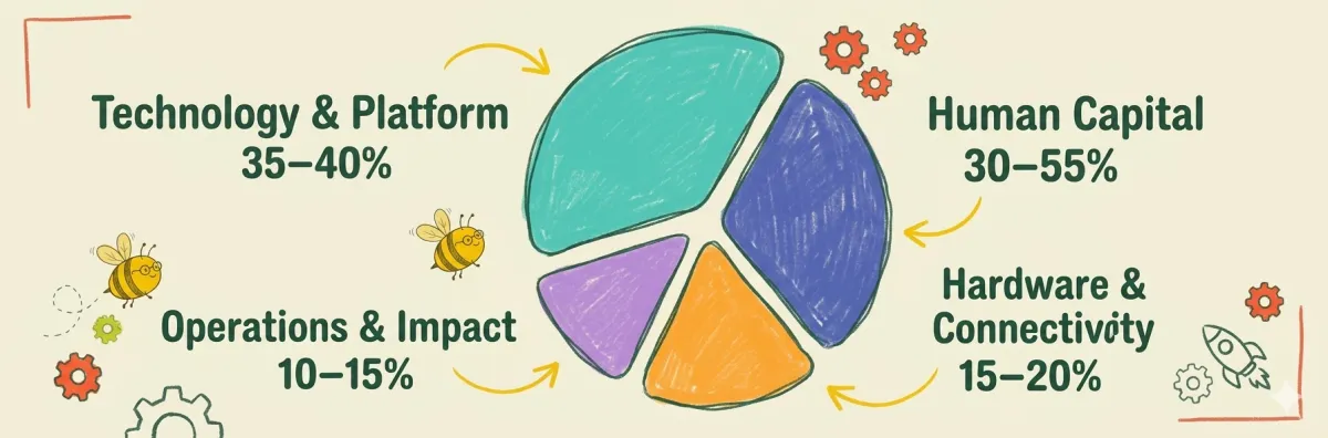 Why Early-Stage Costs Are Higher: Initial partnerships intentionally over-fund per-student costs ($180/year) to build regional capacity, technology infrastructure, and reporting systems. As pods scale and parent contributions cover operations, unit economics normalize and your investment multiplies impact.